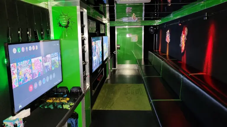 - This climate-controlled, mobile entertainment unit is fully equipped with seven Samsung TVs with Yamaha sound bars, 21 gaming systems such as Xbox, PlayStation, and Nintendo consoles, over 250 video games, 91 Disney infinity characters, multiple controllers charging stations, internet access, virtual reality gear, a Logitech driving wheel, and a Mario & Luigi themed bean bag toss. The trailer also features two rows of stadium seating, is powered by a Predator 9500 generator, has dual 13,500 BTU A/C units, and is towed by a 2500 Dodge Ram. (Home Based)
