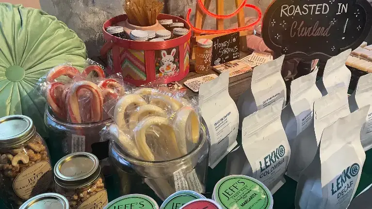 Customers enter the storefront and are greeted immediately with a small marketplace. All of the products are sourced through local partnerships with other north east Ohio business or independent makers. We sell fresh-cut flowers during growing season, coffee, tea, a variety of honeys, candies, sodas, spice blends, soaps, lotions, and more. Beyond the marketplace, customers can order breakfast and lunch sandwiches prepared to order, espresso and other cafe beverages, and admire the cakes, brownies, cookies, sweets, and savory baked goods on display.